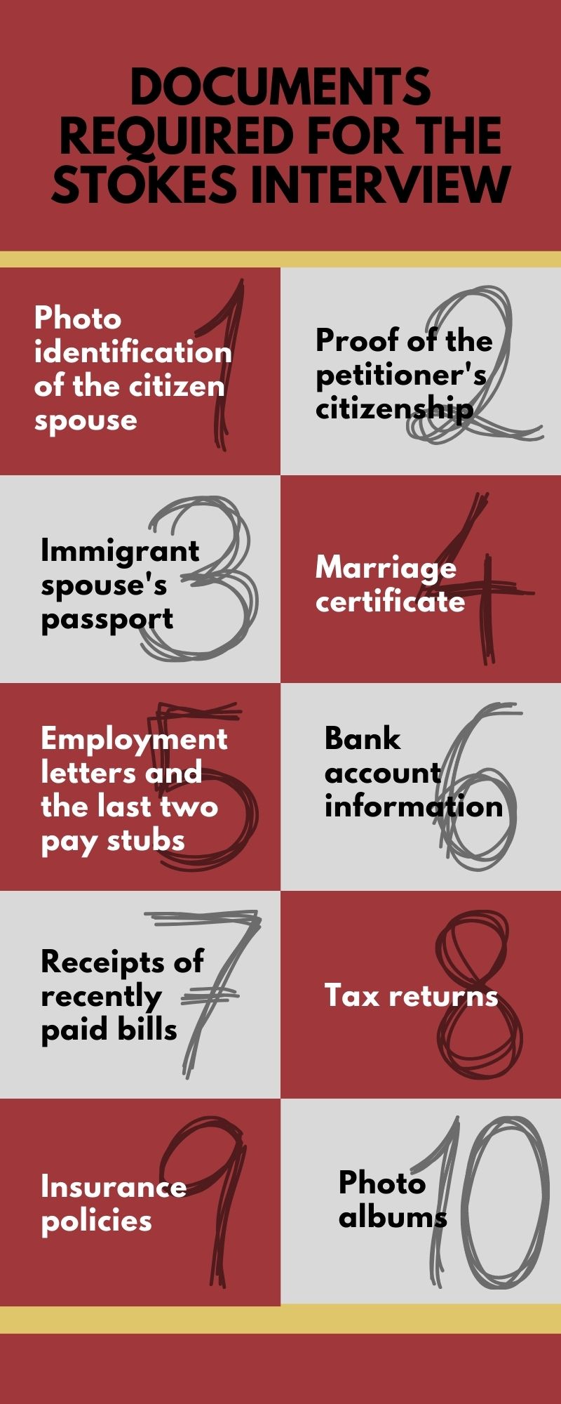 Also called a marriage fraud interview, a Stokes interview is conducted when an immigration officer questions the validity of a couple’s marriage when one spouse is attempting to obtain a marriage green card. The applicants will receive a written notice of this required interview, a list of their rights, and an appointment letter with a list of documents to submit, including: